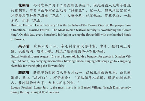 Huazhao Festival: Lunar February 12 is the birthday of the Flower King. So Bai people have a traditional Huazhao Festival. The Most solemn festival activity is "worshiping the flower king". On this day, every household in Heqing sets up the flower hill with one hundred kinds of flowers.
