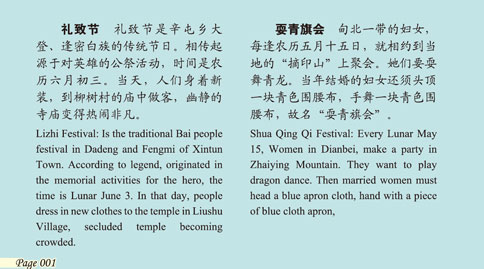Lizhi Festival: Is the traditional Bai people festival in Dadeng and Fengmi of Xintun Town. According to legend, originated in the memorial activities for the hero, the time is Lunar June 3. In that day, people dress in new clothes to the temple in Liushu Village, secluded temple becoming crowded.