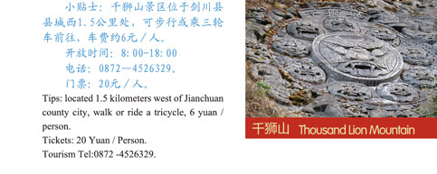 Thousand Lion Mountain:The number of stone lions and the lion great shape, it is worldwide unique, called "two unbreakable records in the world." There are 3268 stone lions, a huge "Lion King" 25 meters high and 15 meters long, 12 meters wide.Tips: located 1.5 kilometers west of Jianchuan county city, walk or ride a tricycle, 6 yuan / person.