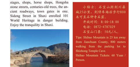 Tips: Shibao Mountain is 25 km away from Jianchuan County, 800 meters walking from the parking lot to Shizhong Temple Cave.