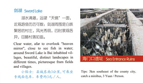 Sword Lake:Clear water, afar to overlook "heaven mirror", close to see fish in water; around Sword Lake is Bai inhabited villages, beautiful, distinct landscapes in different times, picturesque fram fields and villages.Tips: 3km southeast of the county city, catch a minibus, 3 Yuan / Person.